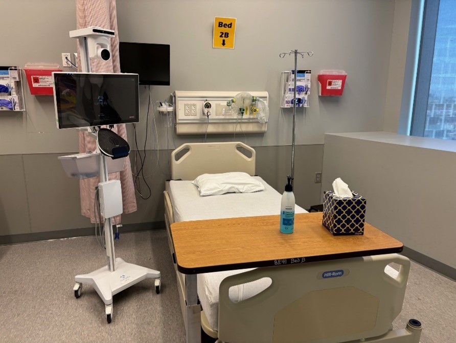A Caregility APS250 mobile telehealth cart positioned by the patient’s bed allows remote nurses to engage with patients virtually using the Caregility iConsult application and AI-enhanced Connected Care™ platform.