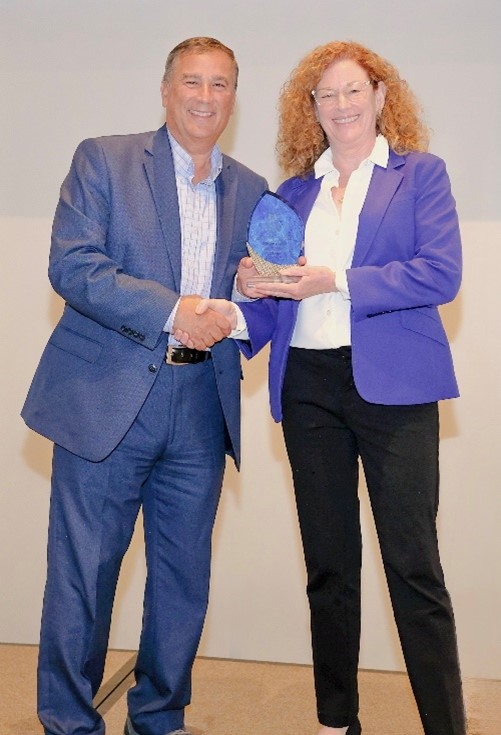 Mike Brandofino, Caregility President and COO (left), awards Kate Morse, PhD, MSN, RN, AGACNP-Ret, Assistant Dean of Simulation and Innovation, College of Nursing and Health Professions at Drexel University (right), with the Community Impact Award at the 2025 Caregility Customer Connect Summit.